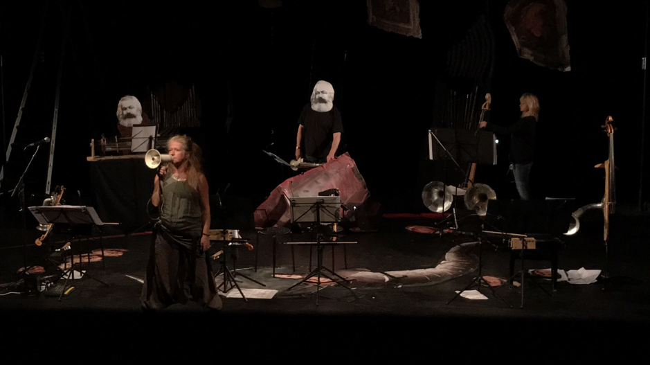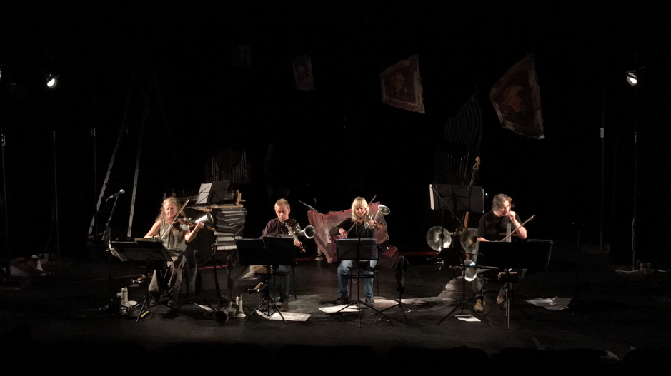 KEIN is a continuing exploration and extension of François Sarhan’s fascination with the absurd, counterintuitive and virtuosic in both presentation and performance practice. The four performers of Red Note’s core string quartet have been given a number of familiar / unfamiliar newly designed and constructed instruments-the majority derived from Stroh instruments – to play by François, as well as being required to create a performance that embraces the use of the voice, theatrical techniques and François’ use of a distinctive mise en scène in his characteristically absorbing visual and musical style.